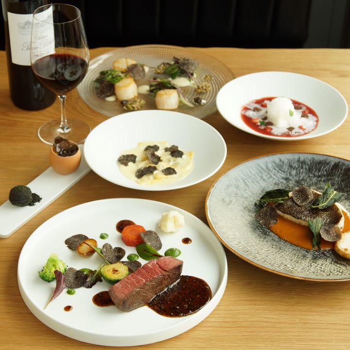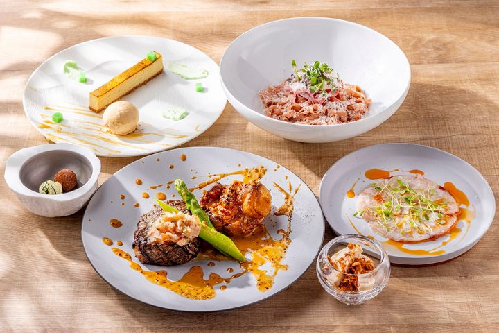 先付から始まり、彩りプレートに「真鯛の炭火焼き 桜海老オイル 蕪のピュレ」や「牛ほほ肉と春菊 宗田節の餡かけ」など、魚と肉から選べるメイン、デザートなども付いた全7皿の料理は、見た目にも華やかで記念日や“ハレの日”にもおすすめ。(メニューは季節によって変動)