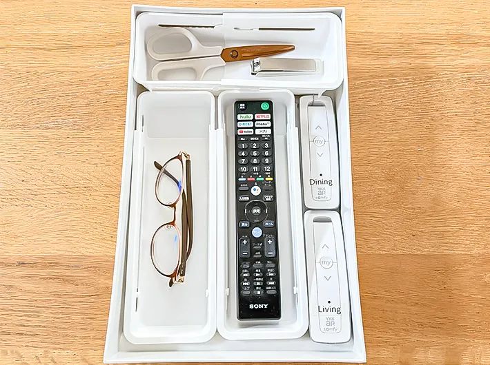 上の画像はリビングで使うものをまとめた引き出しです。浅型トレーだと使用頻度の高いものもサッと取り出せてノンストレス。