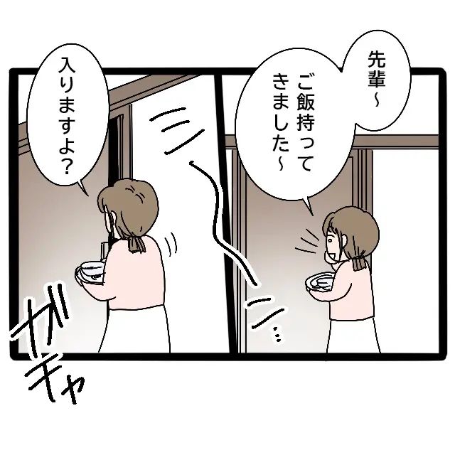 みずほ先輩の部屋のドアをコンコンとノックし、「先輩~ご飯持ってきました~」と声をかけます。しかし返事はありません。まだ眠っているのかもしれないと思いましたが、せっかくなら温かいうちにご飯を食べてほしい。そう思った私は、「入りますよ?」と声をかけて部屋に入りました。