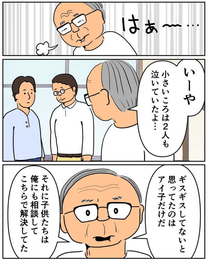 義父は大きくため息をつくと「いーや、小さい頃は2人とも泣いていたよ」と、紘一と元久さんに視線を向けながら言いました。そして義母に向き直ると、「ギスギスしてないと思ってたのはアイ子だけだ、それに子どもたちは俺にも相談してこちらで解決してた」と真剣な表情で言い切りました。