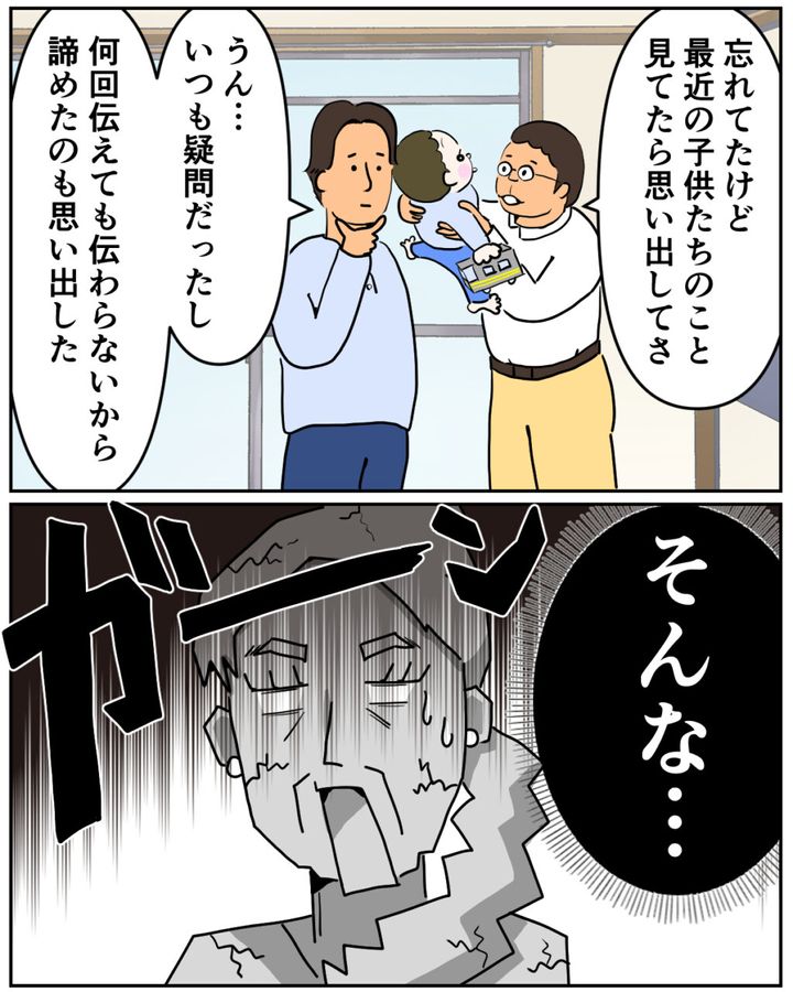 「忘れてたけど、最近の子どもたちのこと見てたら思い出してさ」「うん、いつも疑問だったし、何回伝えても伝わらないから諦めたのも思い出した」昔を振り返りながら、そう話す紘一と元久さん。その言葉を聞いた義母は、「そんな・・・」と言葉を失って立ち尽くしました。