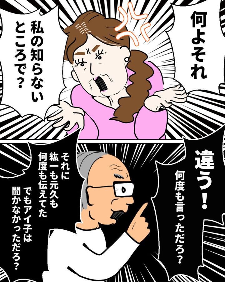 自分の知らないところで問題が解決されていたと知った義母は仲間外れにされたと感じたのか、「何よそれ、私の知らないところで?」と怒りをあらわにします。すると義父は、「違う!何度も言っただろ?それに紘一も元久も何度も伝えてた、でもアイ子は聞かなかっただろ?」と諭すように問いかけました。