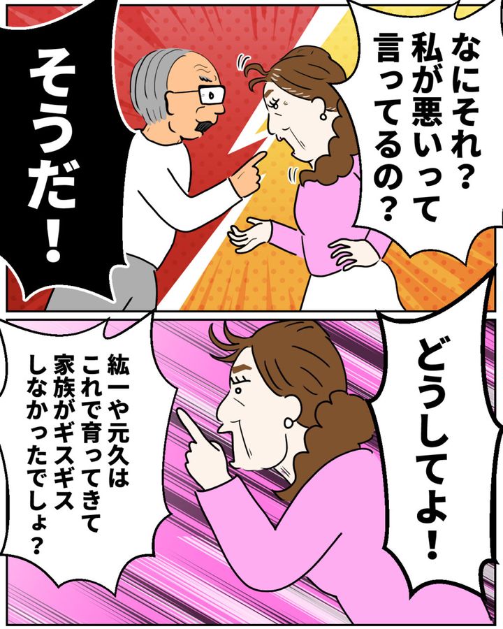 すると義母は、「なにそれ?私が悪いって言ってるの?紘一や元久はこれで育ってきて、家族がギスギスしなかったでしょ?」と、自分の考えは間違っていないと言わんばかりに声を荒げました。