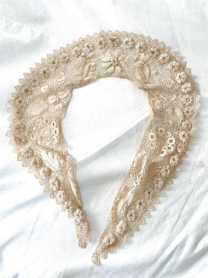 おなじみ定番のTシャツとコットンパンツに合わせるレースブラウス。デニムジャケットのエリ元に差し込むレース編みの付けエリ、ショール。季節にピッタリだと今の自分にも似合うように感じてくる。