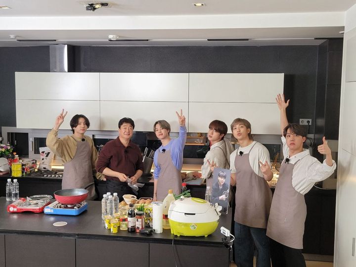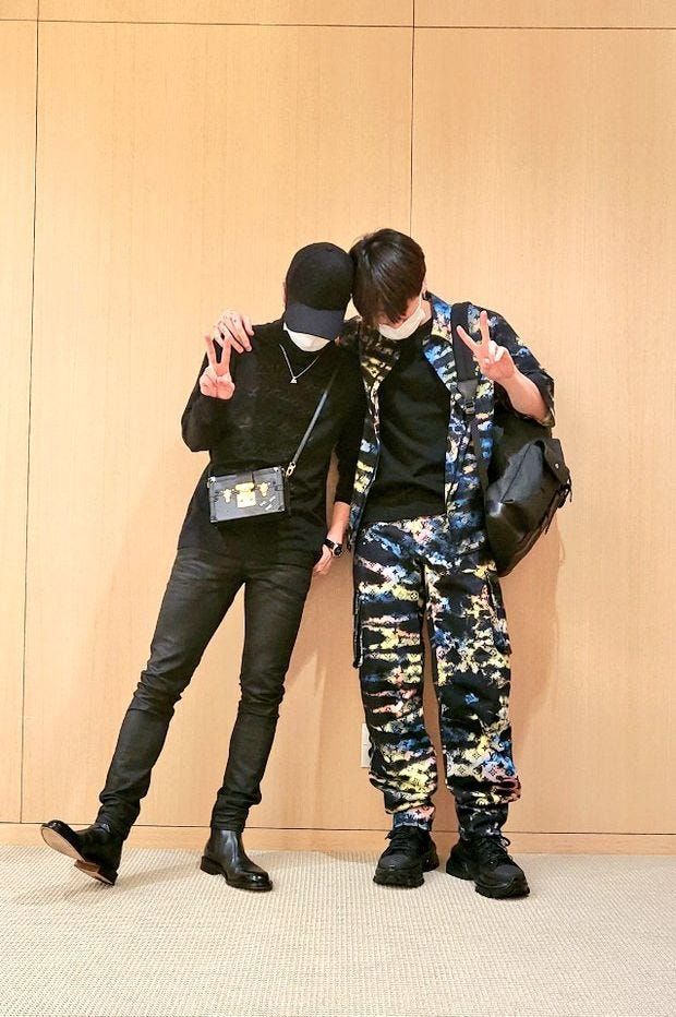 最年長メンバー、ジンの除隊を記念してBTSメンバーが大集合。ジョングク(左)とジミン(右)は軍服を着て、ジンの除隊を祝いに駆けつけた。