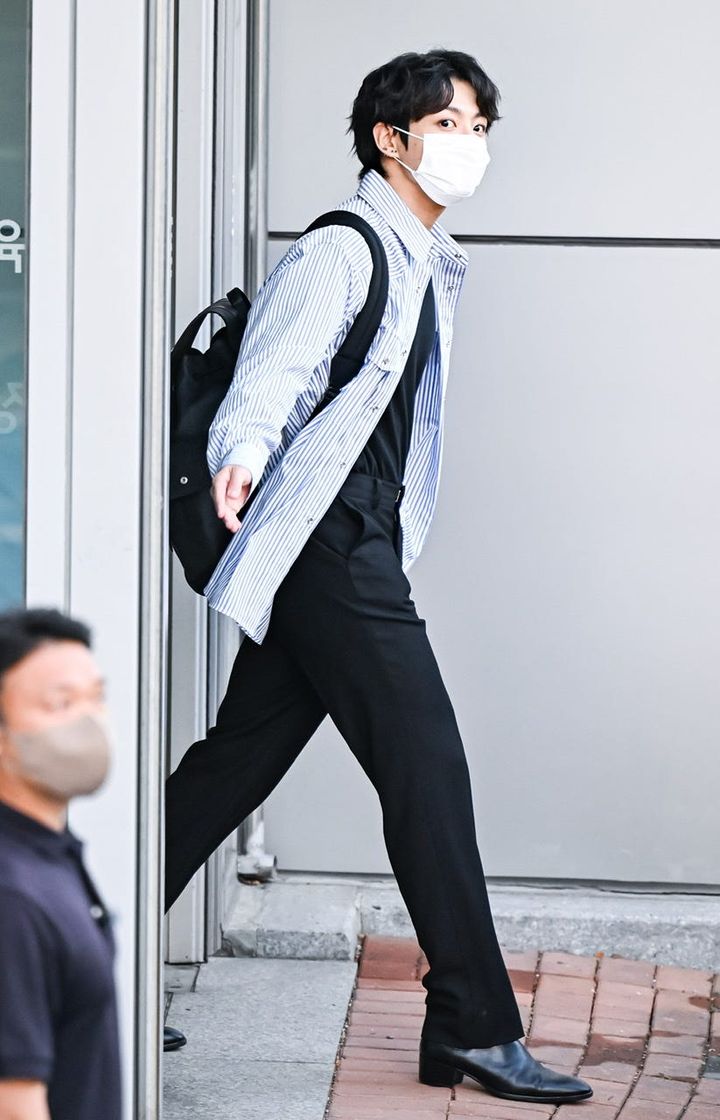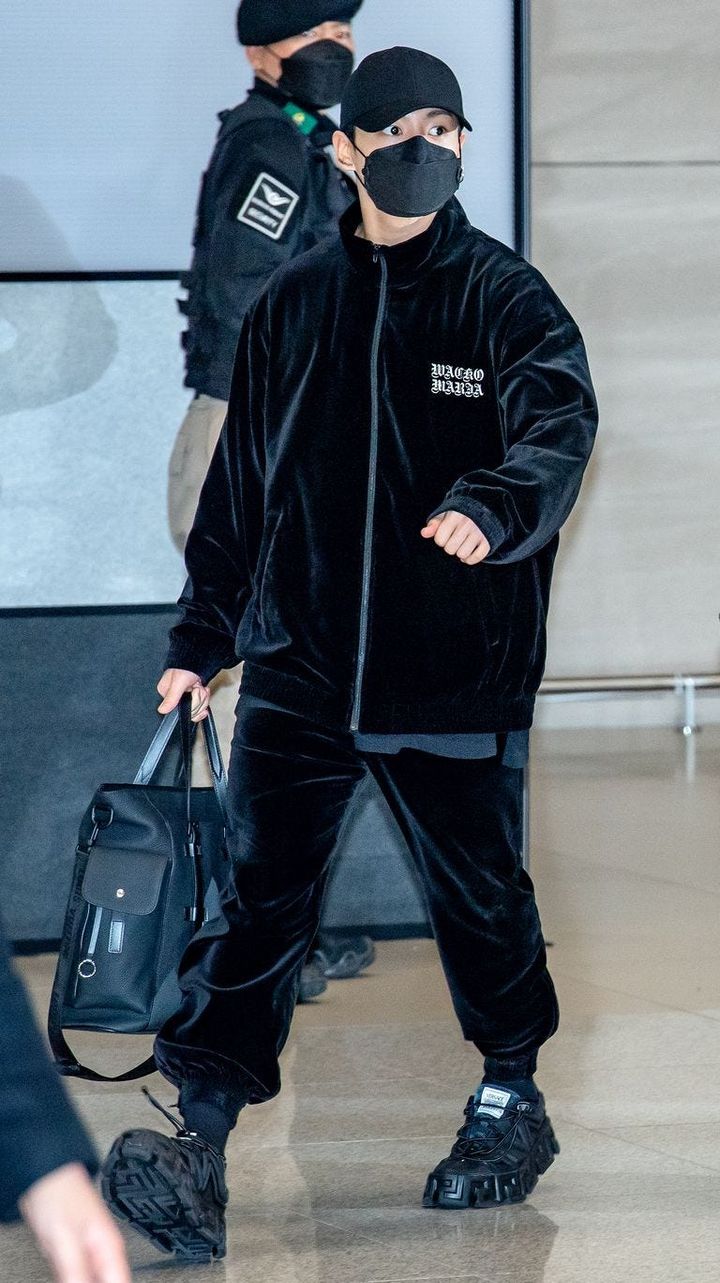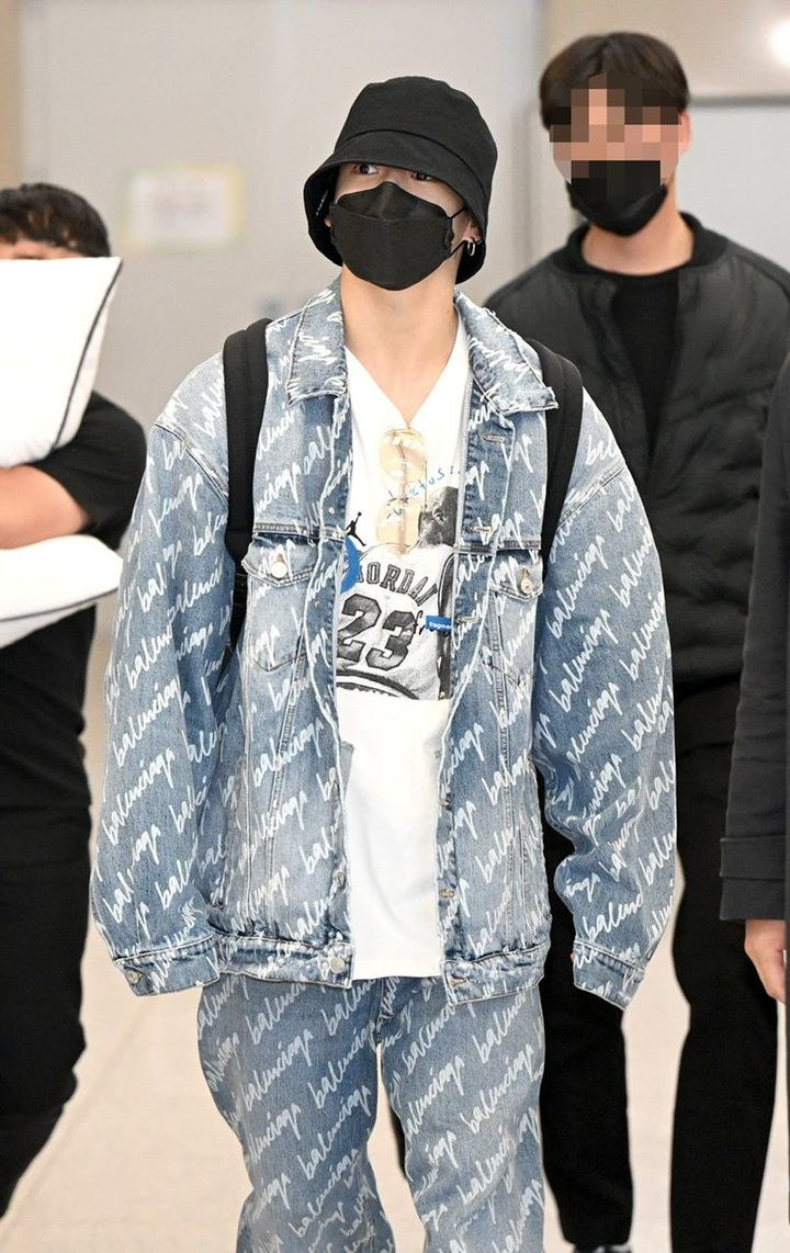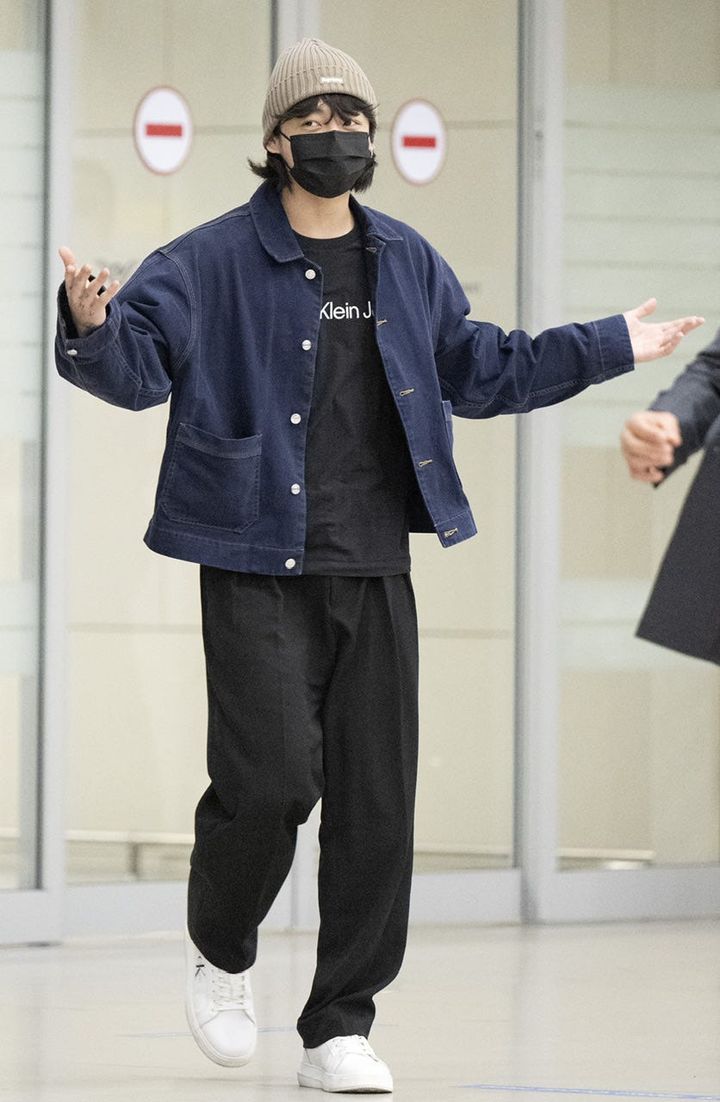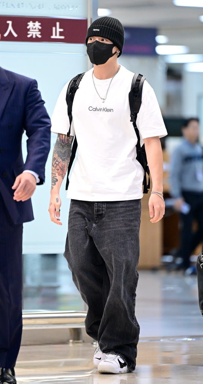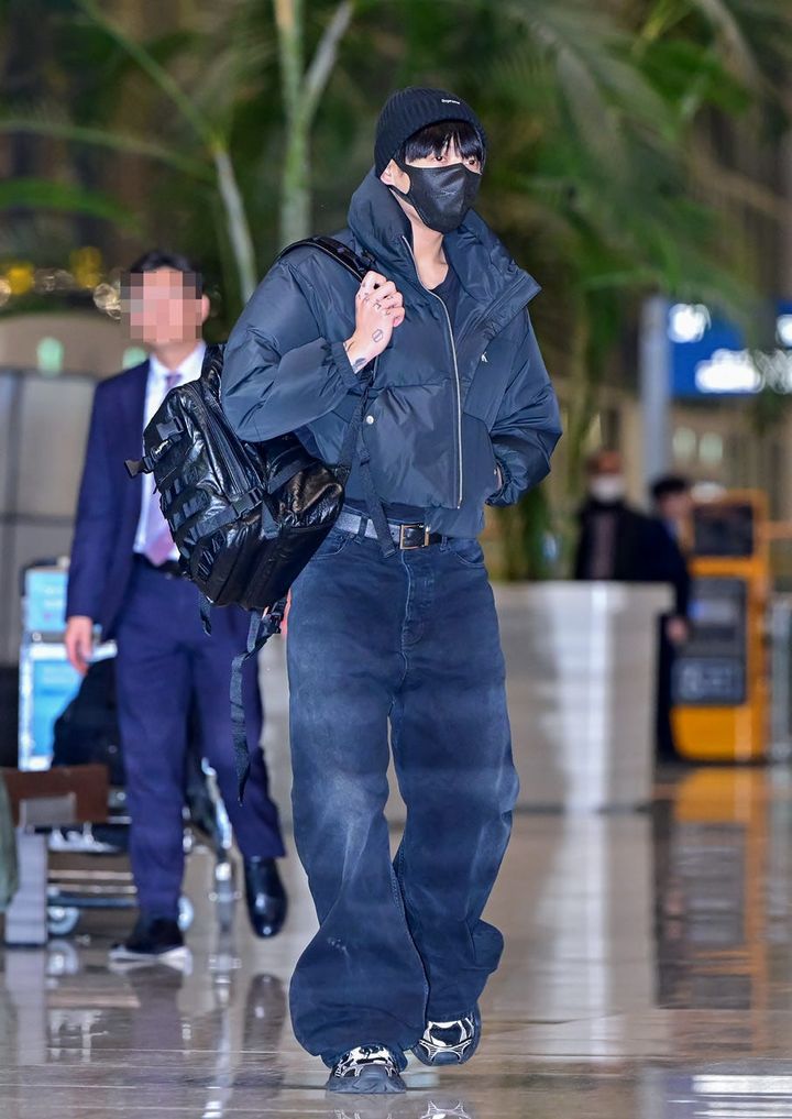 自身がアンバサダーを務める「カルバン クライン」のダウンジャケットを羽織り、アメリカに向けて出国。ジョングク定番のダボっとしたパンツに、すっきりとしたクロップド丈アウターを合わせればスタイルアップ効果抜群。