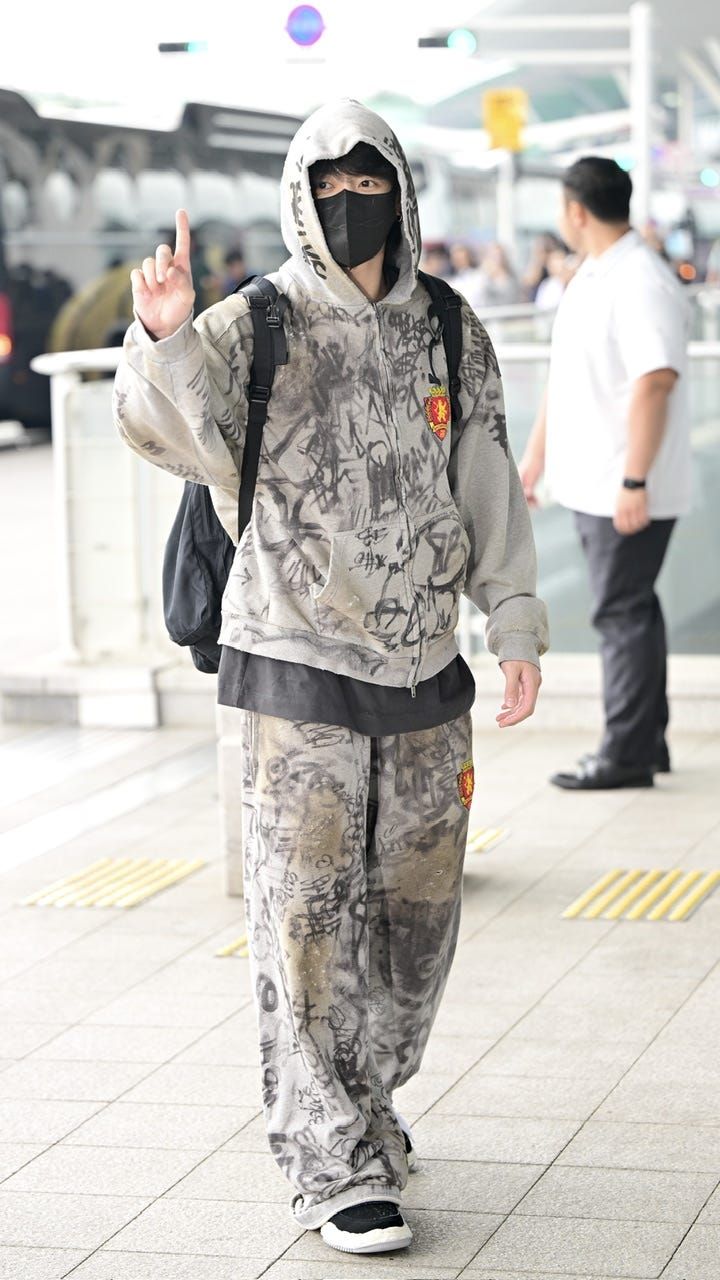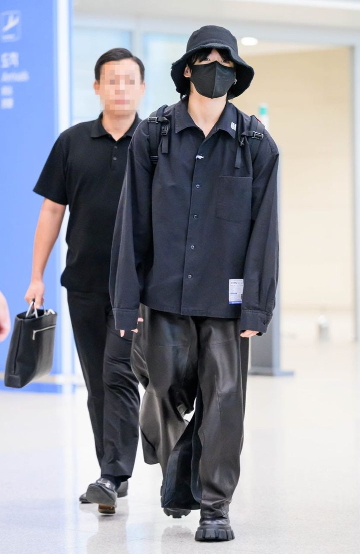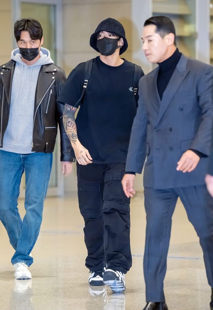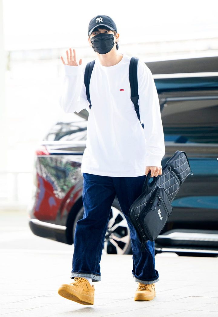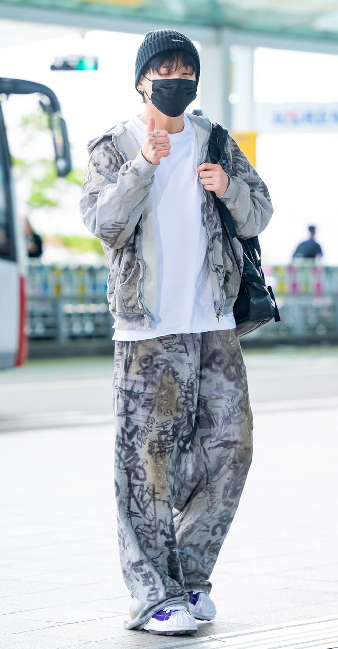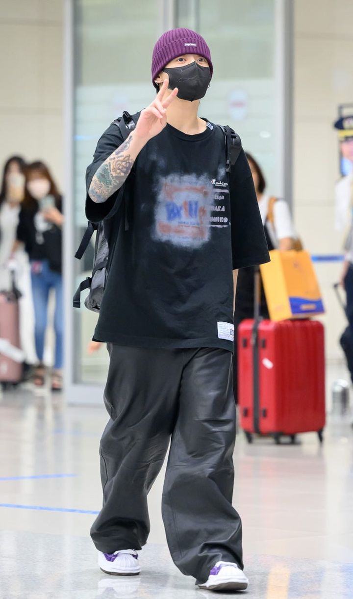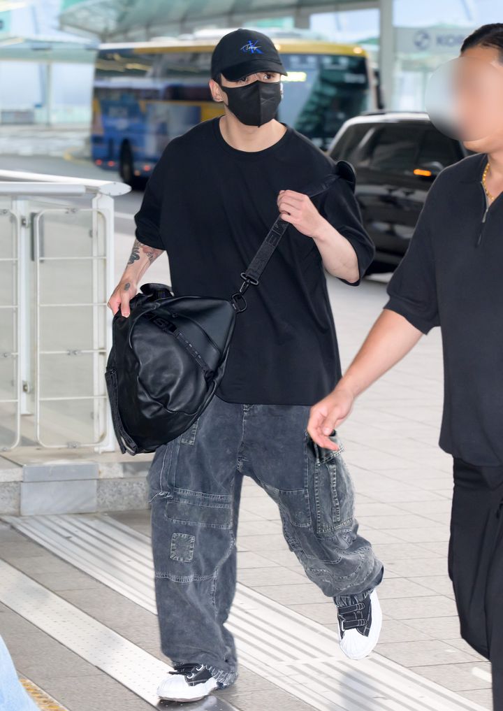 仁川空港からアメリカに向けて出発するところをキャッチ。オールブラックコーデで目立つことを避けたつもりが、ゆるりとしたシルエットのTシャツ&カーゴパンツのエフォートレスな着こなしに、センスとオーラがだだもれ。