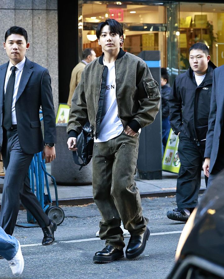 移動中のジョングクをニューヨークでキャッチ。グランジ感のあるデニムのセットアップを着用すれば溢れるスターオーラが止まらない!