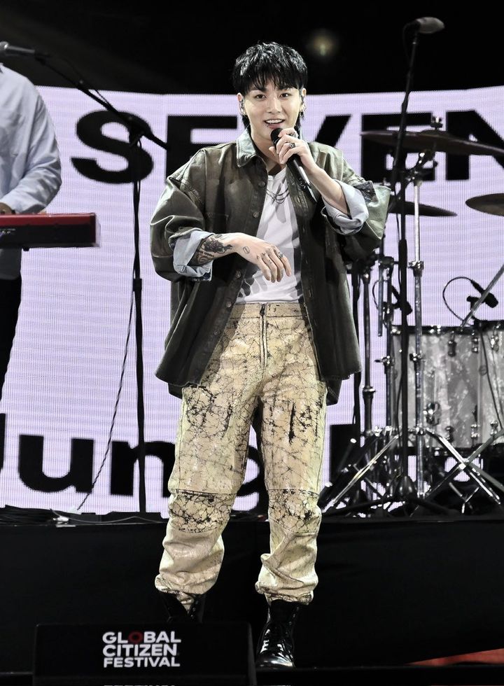 「グローバルシティズン・フェスティバル」に出演したジョングク。ロックなムード漂う「ディーゼル」バイカーレザーパンツに、ダーティ加工を施した「アクネ ストゥディオズ」のデニムシャツを合わせて、ワイルドにスタイリング。