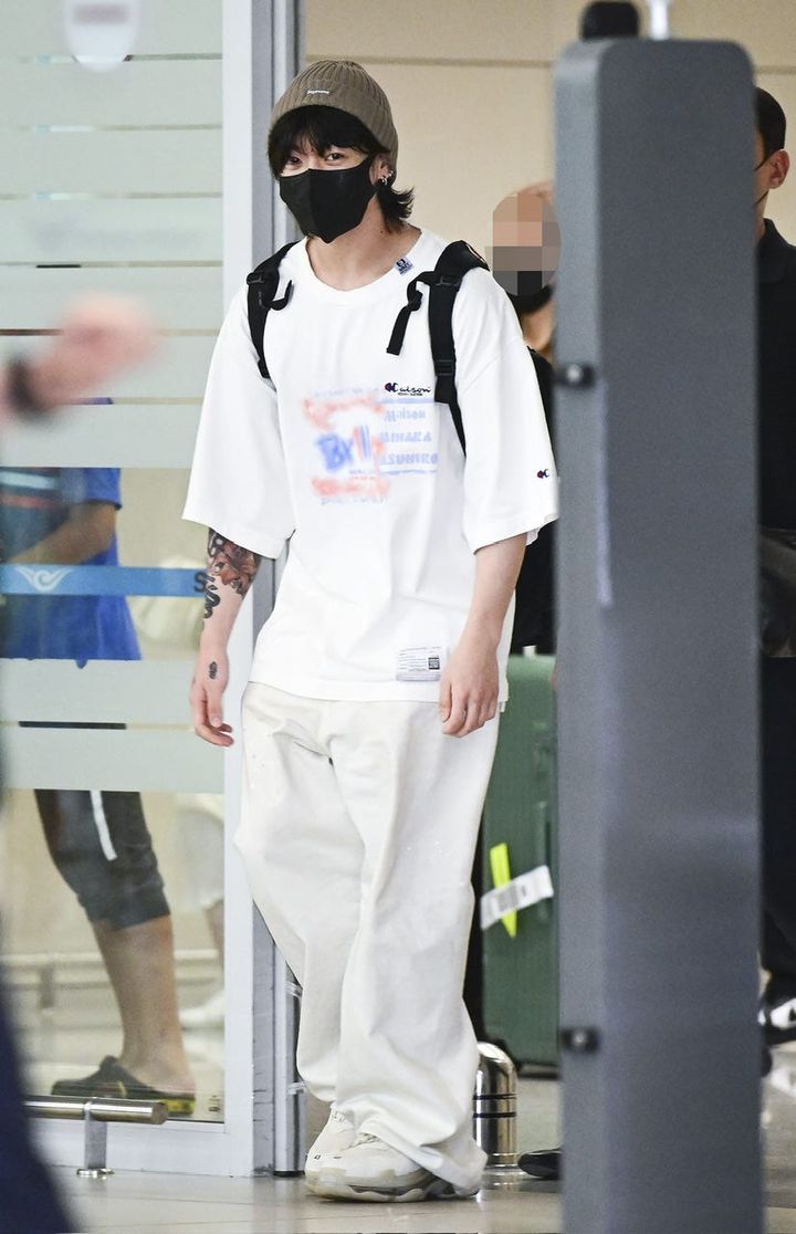 好感度&清潔感抜群のオールホワイトスタイルを披露! オーバーサイズのTシャツに、ワイドパンツでシルエットはストリートムード満点なところがグクらしい。