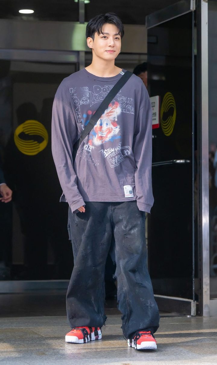 音楽番組「ミュージックバング」の事前収録に向かうジョングクをキャッチ。ピエロが描かれたグラフィックTシャツは、ジョングクが寵愛する日本ブランド「ミハラヤスヒロ」のもの。