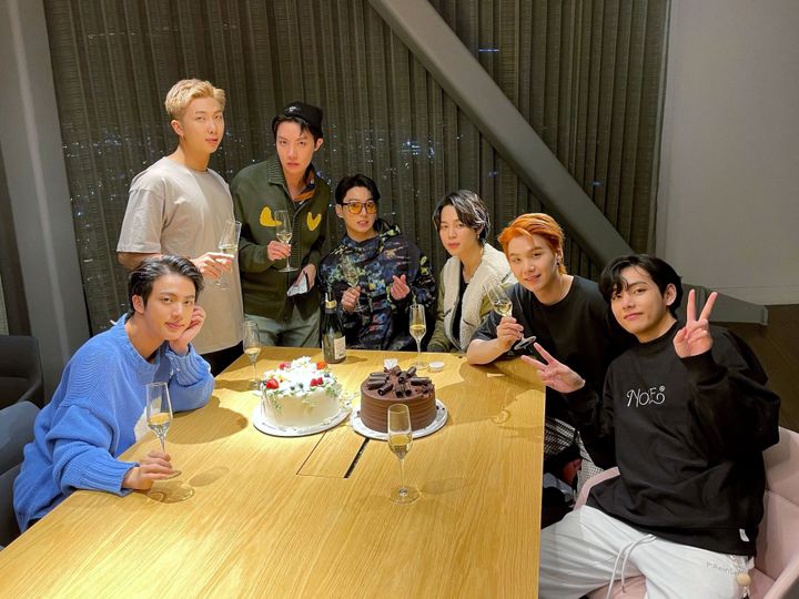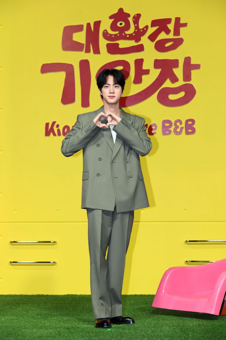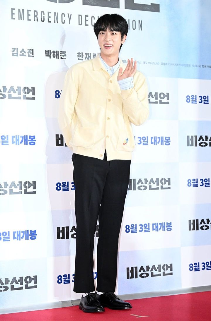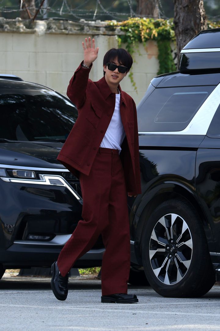 J-HOPEの除隊を祝いに駆けつけたジンは、「グッチ」からセレクトしたボルドーカラーのセットアップに、サングラスをかけたスターな装いで登場。