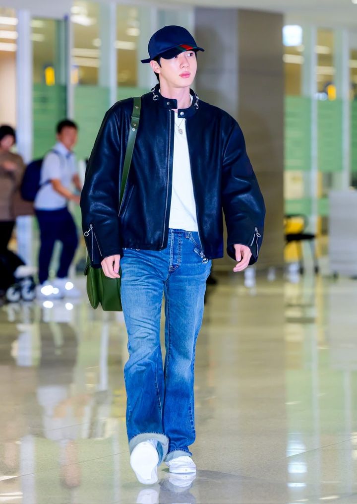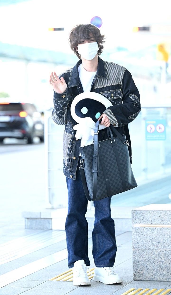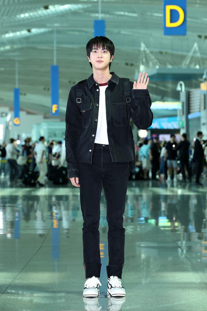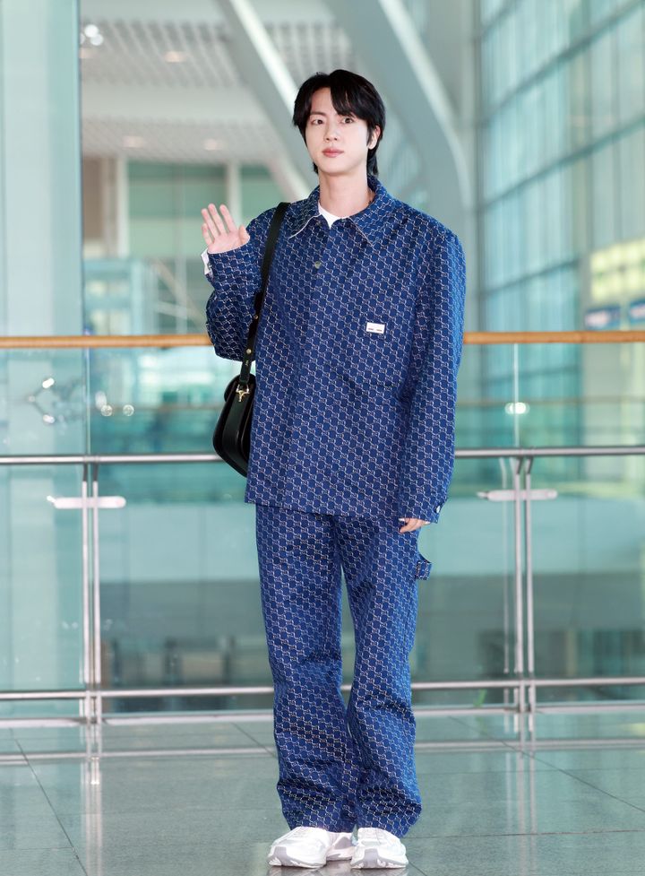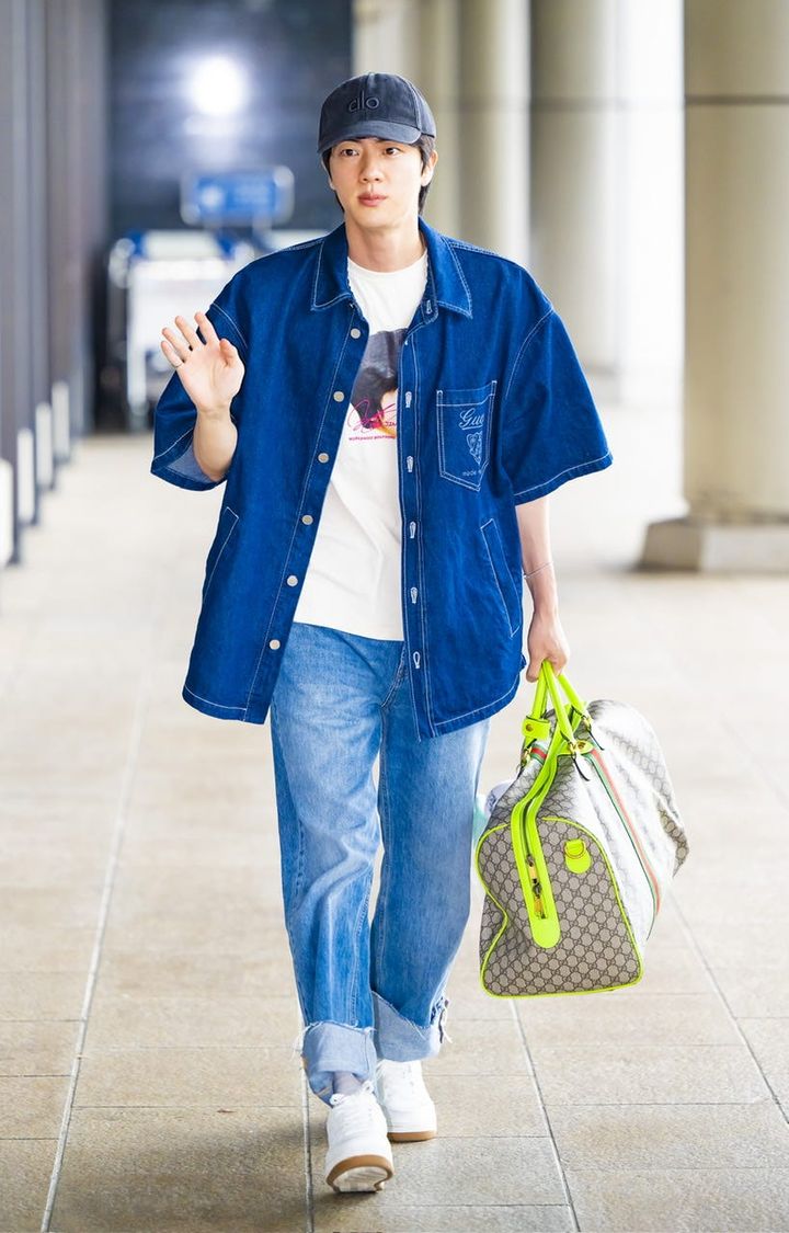 ミラノに向けて出国するジンは、デニムONデニムでカジュアルに。全身を「グッチ」で統一しながらも、少年のような雰囲気を纏えるのがジンの魅力。