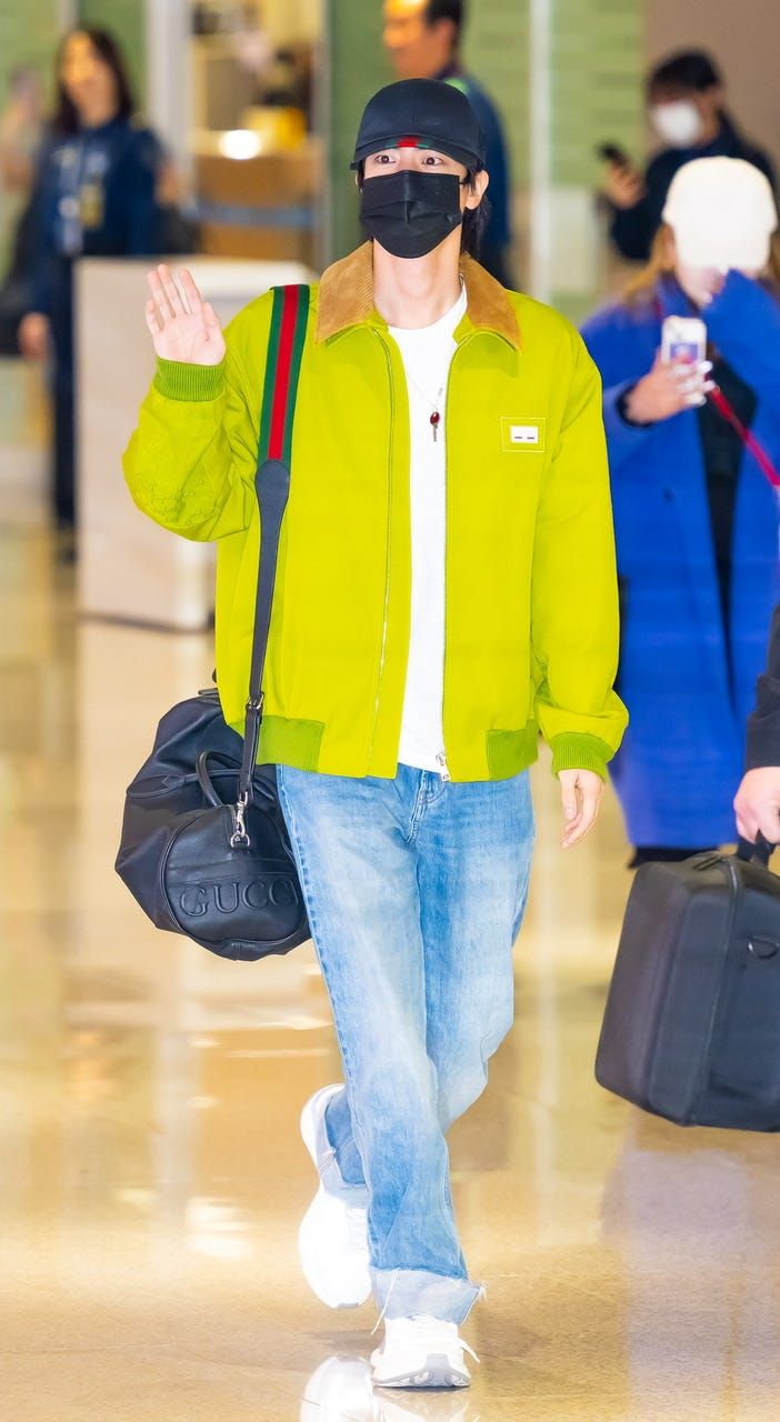 ミラノから帰国したジンを仁川国際空港でキャッチ! 鮮やかな蛍光グリーンのジャケットは、デニムと合わせてほどよくカジュアルダウン。