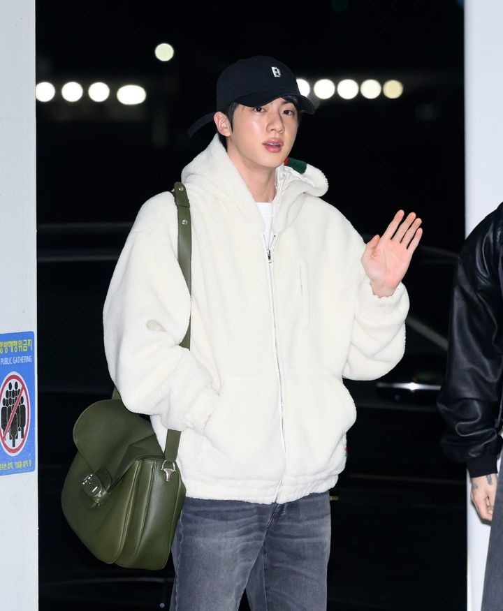 ジンの端正なビジュアルを引き立てる真っ白なボアジャケットに、カーキのショルダーバッグをアクセントとしてオン。クリーンな配色で洗練されたカジュアルスタイルに。