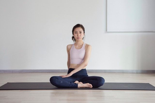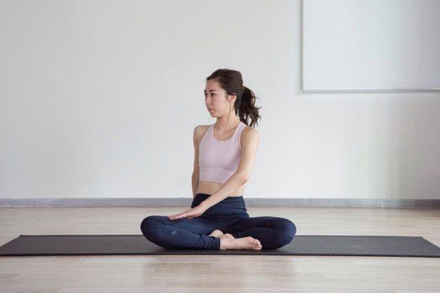 あぐらの姿勢で座り、背骨をまっすぐ上へ伸ばします。骨盤を軽く立て、左右のウエストが同じ長さになるよう意識。右太ももの上に左手を置き、まずは体の軸を安定させます。