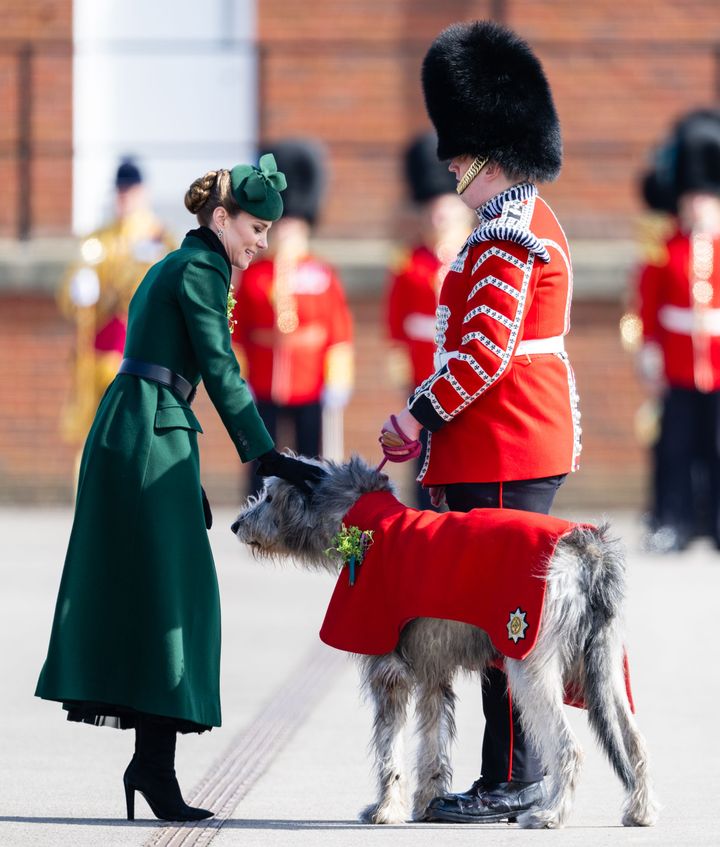 また、キャサリン妃は伝統に倣い、隊員と連隊のマスコット犬であるアイリッシュ・ウルフハウンドにシャムロックの小枝を贈呈。連隊長としてパレードで敬礼を受けた後、連隊の兵士たちに長期勤続勲章と善行勲章を授与した。関係者との面会や記念撮影に参加した後は、下士官食堂にて隊員と家族に会い、彼らの貢献を称えた。食堂では、キャサリン妃もアイルランドの名物であるギネスビールで乾杯するのが習わしだという。