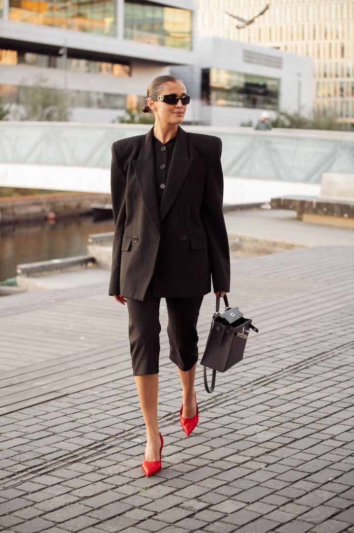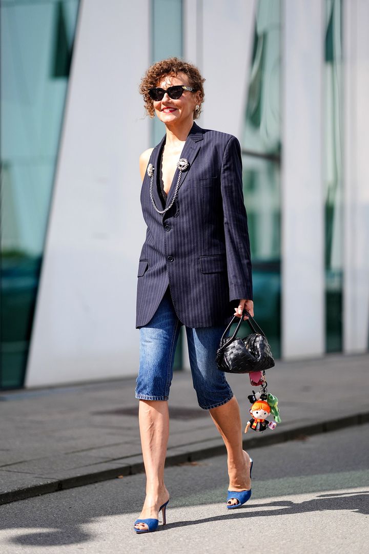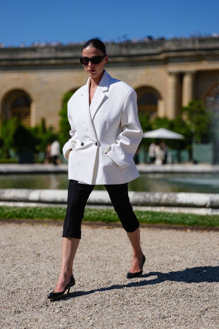 最後に、オフィスのカジュアルデー──たとえば木曜や金曜──には、2000年代にマーク ジェイコブスMARC JACOBS)のランウェイで人気を集めたデニムのカプリパンツを取り入れて。ラフに見えがちなアイテムも、ブレザーや白シャツを合わせれば、洗練されたオフィススタイルに仕上がる。