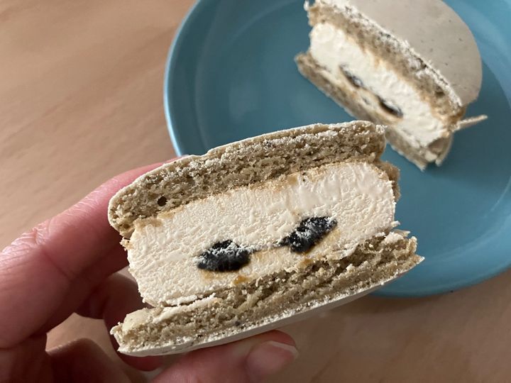 ほうじ茶ソースを入れたほうじ茶ラテアイスをほうじ茶葉入りのマカロンでサンドした商品。