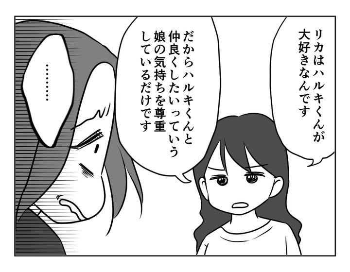 私(ナツキ)は、夫と2人の娘(小4と年中)との4人家族。年中さんのリカは明るく活発なタイプです。同じクラスの「ケンシンくん」のママ・エツコさんから、ケンシンくんがリカのことが好きだと聞きました。ケンシンくん親子がグイグイくる様子に、なんだかイヤな予感がします。さらに習い事やお出かけも合わせてきて、まるでストーカー。ついにはリカから相手にされなくなったケンシンくんが、怒ってリカを突き飛ばしたのです! そんな状況で「ウチに来ませんか?」とぬけぬけと誘ってくるエツコさん。するとリカが「ハルキくんと遊びたい」と宣言。私も「娘の気持ちを大切にする」と言い切ったのです。