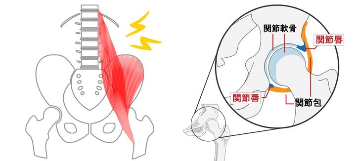 関節自体の問題としては、軟骨がすり減る変形性股関節症、股関節唇の損傷、関節内の炎症などがあります。一方、関節周囲の問題としては、腸腰筋や臀筋の硬さ・疲労、腱炎、滑液包炎などが挙げられます。