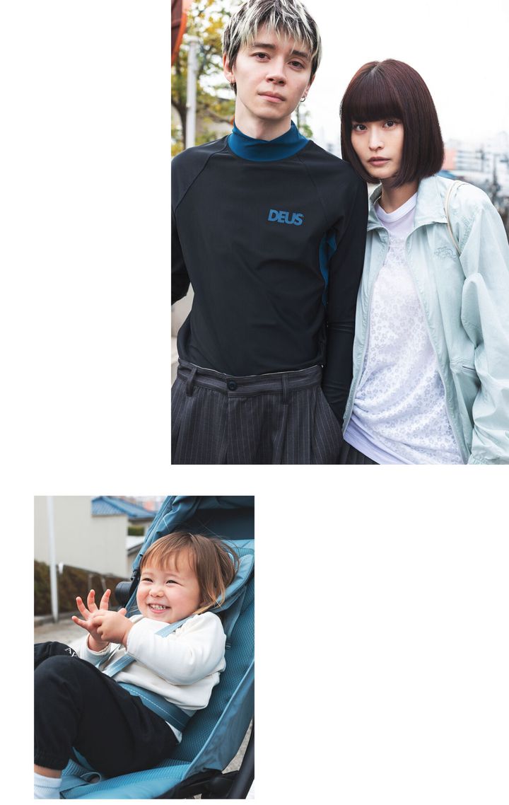 ひんやりとした色使いがいまの気分。ただ、単調で終わらせたくないから、ベビーカーのブルーでキュッと引き締め! 家族でスポーティにまとめつつ、ママは花柄や透け感でガーリーさをプラス。メタル調なスニーカーも、さりげなくリンク。このまま公園にも行けちゃう動きやすさとおしゃれのちょうどいい塩梅で◎。[mama]アウター¥23,100/ザ・ノース・フェイス(ゴールドウイン カスタマーサービスセンター)、トップス¥12,980/オブラダ(シンチ)、タンクトップ¥7,700/フレック(ハウス バイ ジャック オブ オール トレーズ)、プリーツスカート(レギンス付き)¥30800/エフシーイー®︎(エフシーイーフラッグシップストア)、スニーカー¥25,300/サロモン(サロモン コールセンター)、タイツ=スタイリスト私物