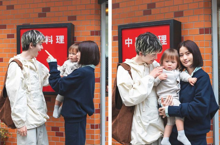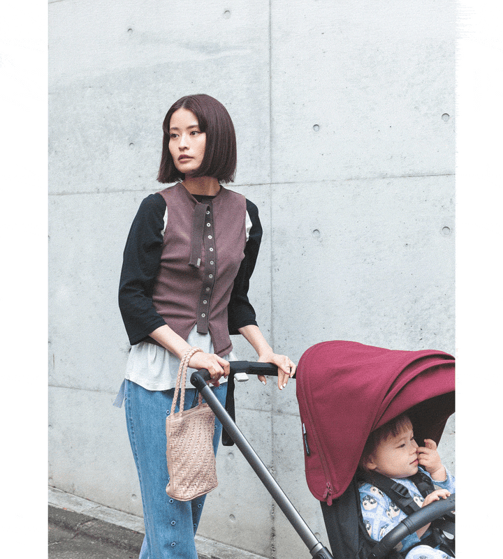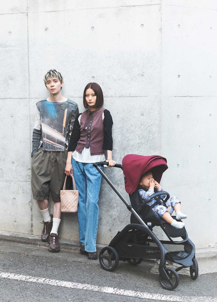 ワインレッドのベビーカーが主役になるように、全体は落ち着いた雰囲気に。パパの柄物も色味を揃えることで、大人な統一感のある着こなしに昇華。ベビーはインヤン柄のそう柄ロンパースをまとって、気分が明るくなるアイテムを取り入れつつも、家族でリンク感のあるスタイルに。ママはトップスをレイヤードしたりと、遊び心をひとさじ。[mama]ラグラントップス¥18,700/オブラダ(シンチ)、タンクトップ¥22,000、ボトムス¥44,000/ともにコトハヨコザワ(オン・トーキョー ショールーム)、バッグ¥25,300/ベンビエン(モットハウス・トーキョー)、ブーツ¥25,300/ALM.