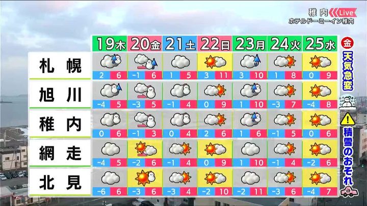 ※18日午後5時時点の情報です。最新の気象情報は、HBCウェザーセンターのホームページなどでご確認ください。HBCは気象庁の認可を2001年に得て以来、民間気象会社の一つとして「HBCの独自予報」を発信しています。