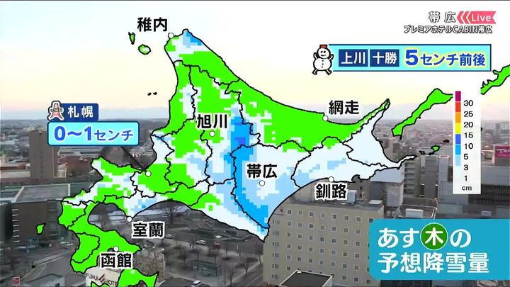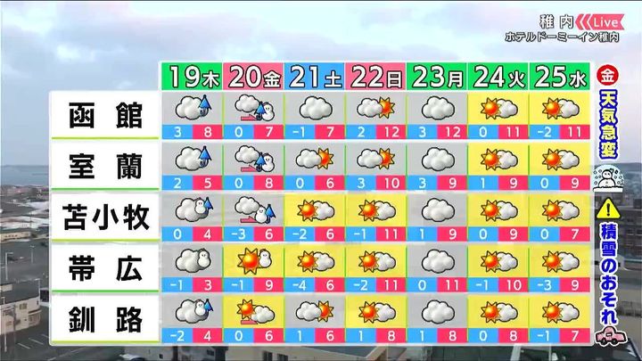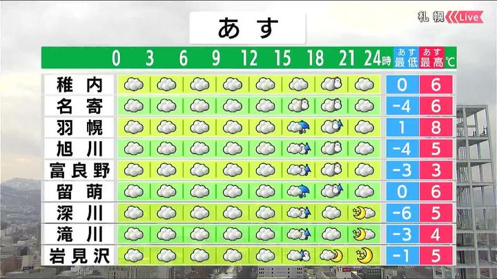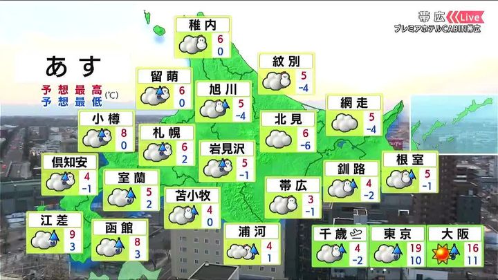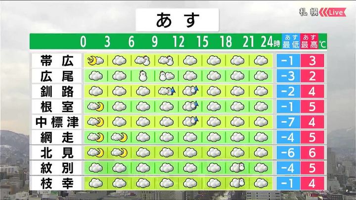 短い時間ですが、雪や雨が降るでしょう。念のため傘があると安心です。気温は朝から広くプラスでしょう。日中はきょう18日(木)より低めで、帯広は3度と寒くなります。