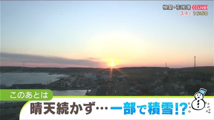 根室花咲港は、夕日がきれいです。今日の根室の日の入りは午後5時27分です。晴れの天気は長く続かず、あすは一部で雪が積もりそうです。