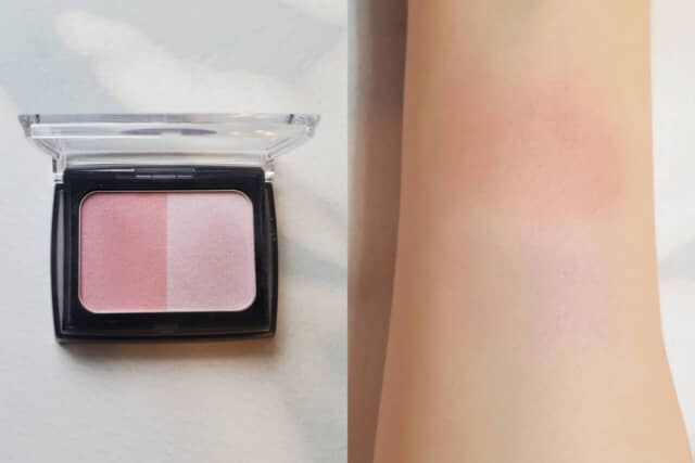 写真の“11 メロウピンク”は、肌なじみの良いピンクカラーと、ゴールド&ピンクパールを配合したツヤカラーの組み合わせ。2色を混ぜることで柔らかな血色感と自然なツヤが生まれ、表情を明るく見せてくれます。なめらかなパウダーには美容保湿成分も配合されており、乾燥しやすい頬にもなじみやすく、時間が経ってもくすみにくい点も魅力です。
