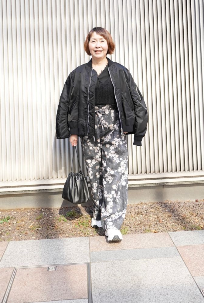 【60代お手本スナップ】低身長さん必見!「サカイ」のブルゾン×花柄ボトムスで好バランスな洒落見えコーデに