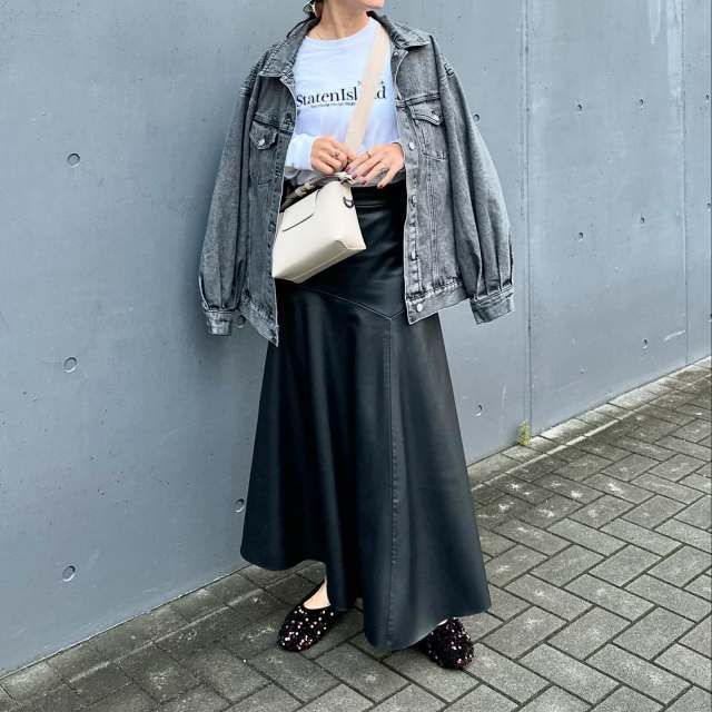 モードに決めたいときは黒レザースカートを選んでみて。このときデニムジャケットは黒orグレーを選ぶと、全身がモノトーンカラーで統一されてハンサムなルックスに。