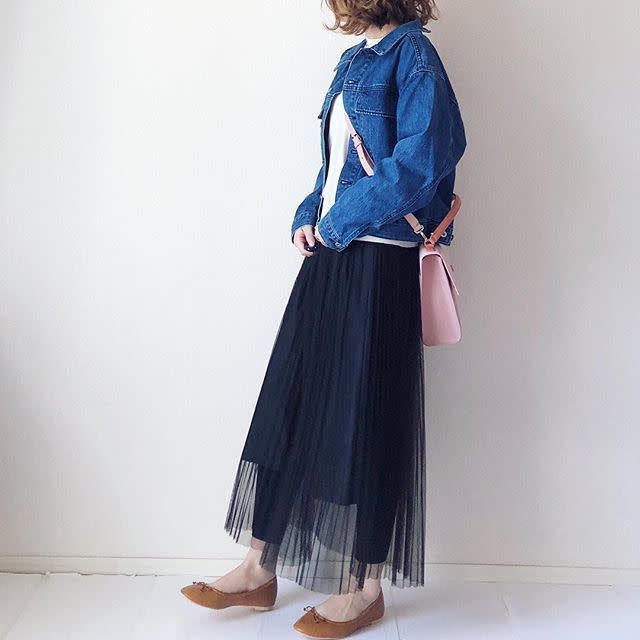 デニムジャケットに合わせる黒スカートをチュール素材で取り入れれば春らしさたっぷりな装いに。透け感のある生地がシーズンムードを醸し出しながら大人可愛く決まります。チュールスカートはガーリーに寄りやすいですが、デニムジャケットのおかげでカジュアルに着こなせますよ。