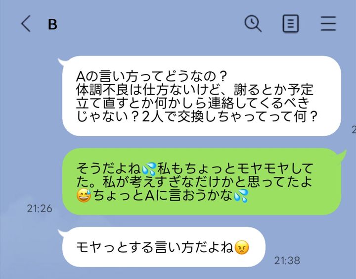 去年の12月末に3人で遊ぶ予定があり、クリスマスも近いしプレゼント交換もしようと話していました。遊ぶ日の2日前にAから体調悪くて行けないと連絡がきました。私は「前日の夜まで様子見てみて、それでもよくならなかったら中止にしよう」と言ったのですが、Aは「いや、これはよくならないから中止で」と言ってきました。その時点で少しモヤモヤしてたのですが、まぁインフルも流行ってるし、もらって帰って子どもに移すのも嫌だなと思い中止にしました。私とBはすでにプレゼントを用意していたので予定立て直したらプレゼント交換すればいいやと思っていたのですが、Aから一向に連絡がなく、Bがインスタのストーリーで私とAをメンションして「そろそろ集まろう」という旨のものを載せました。それにもAからの反応はなかったようです。しかし、今日3人のグループでプレゼント用意しちゃったんだけどどうしようと話をしたところAは「2人で交換しちゃって〜」と言ってきました。それにBが怒り、私に個人的に連絡してきました。「体調不良は仕方ないけど、謝るなり、予定立て直すなり、予定した人がなにかしら連絡してくるべきだと思うんだよね。」と言っていました。たしかに私も子ども連れてプレゼント買いに行けなくて、預けて買い物行ったり大変だったのでBの気持ちはとても理解できました。
