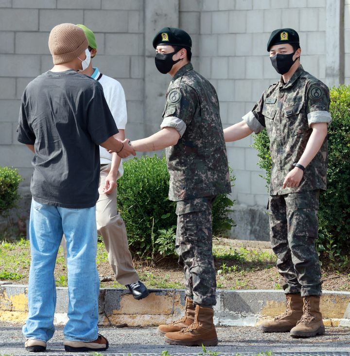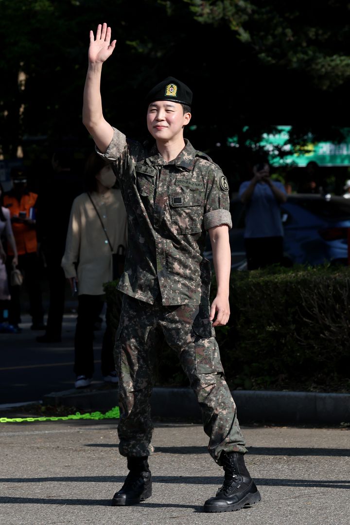 6月10日に一足早く除隊した RMとVに続いて、ジミンとジョングクもついに兵役を終えて部隊を後に。ジョングクはイエローブーツ、ジミンはブラックのブーツで軍服の装いにも個性が光る。