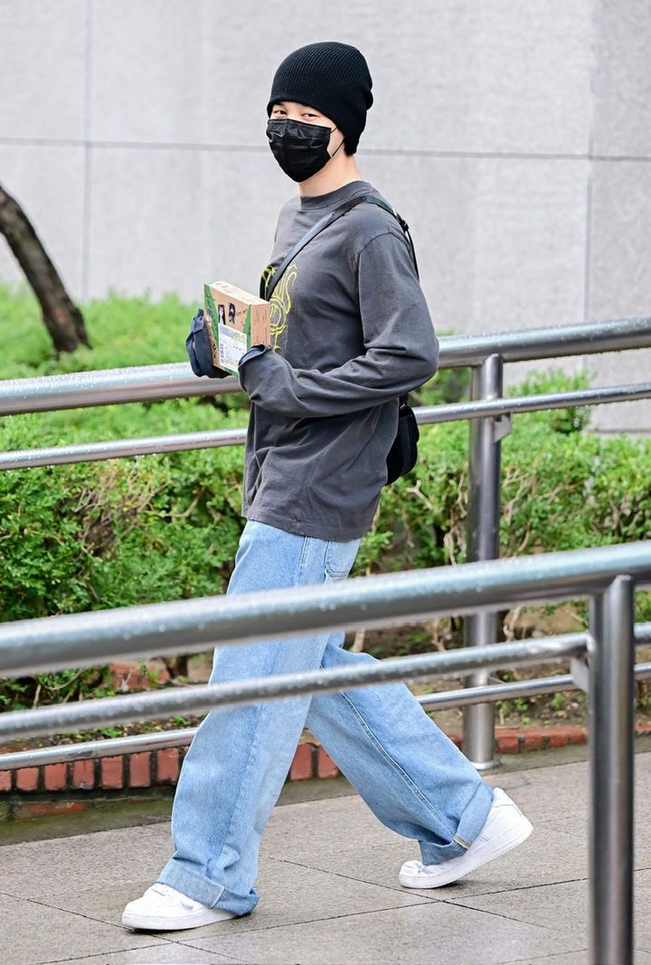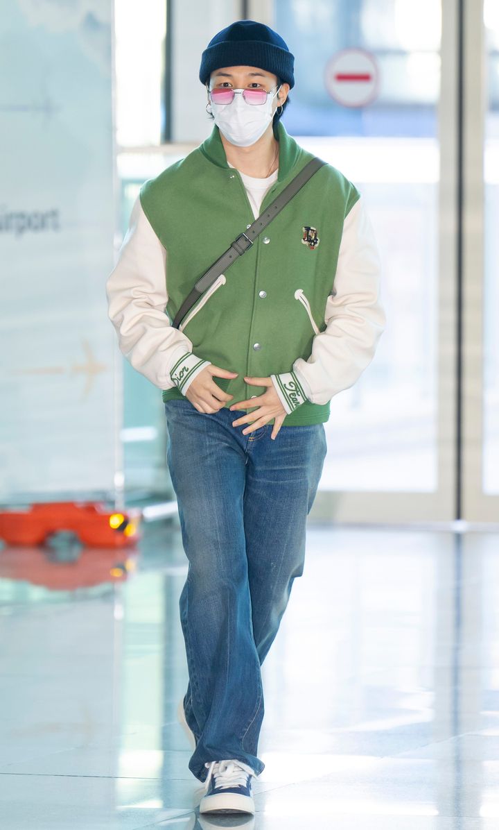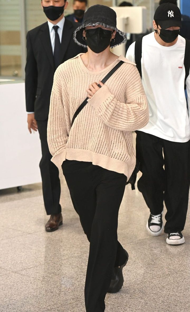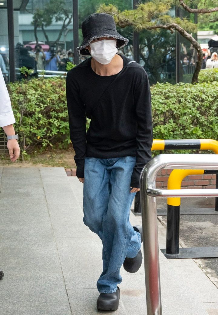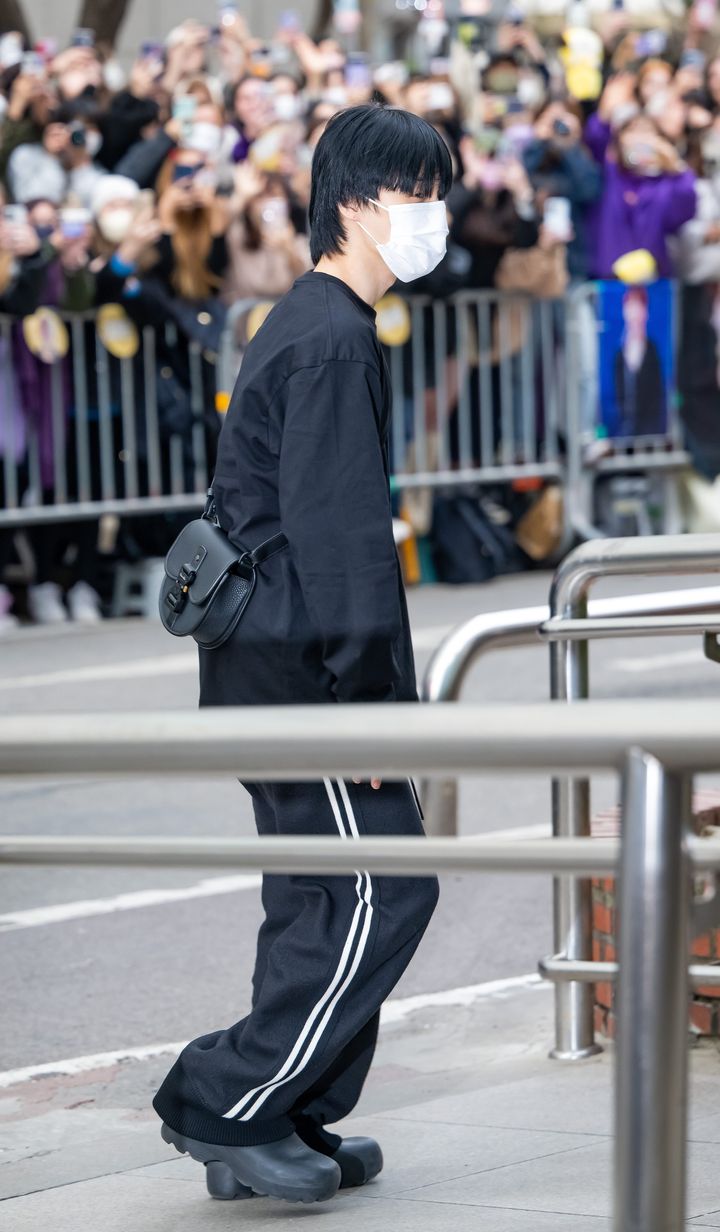 音楽番組『ミュージックバンク』の事前収録に向かうジミンをキャッチ! リラックス感漂うスタイリングながらも、「ディオール」のバッグや「ボッテガ・ヴェネタ」のシューズといったモードなアイテムを効かせたところがおしゃれ上級者ならでは。
