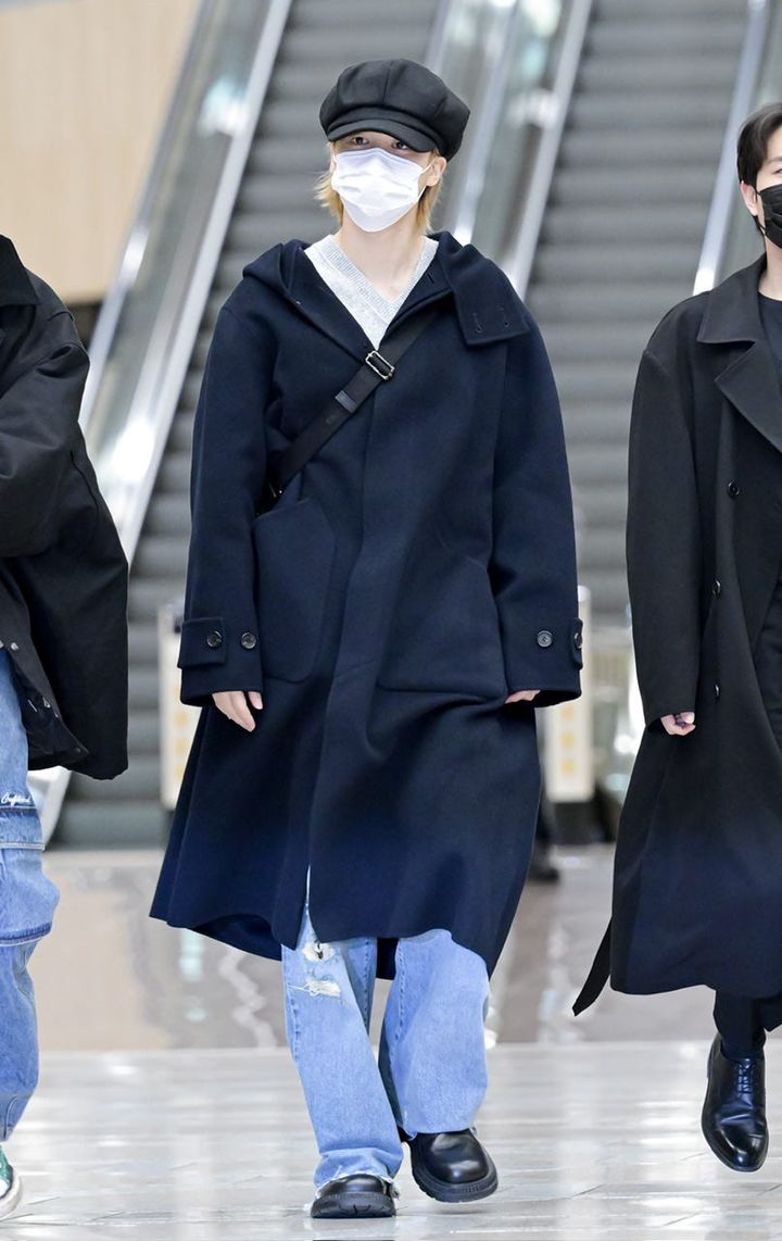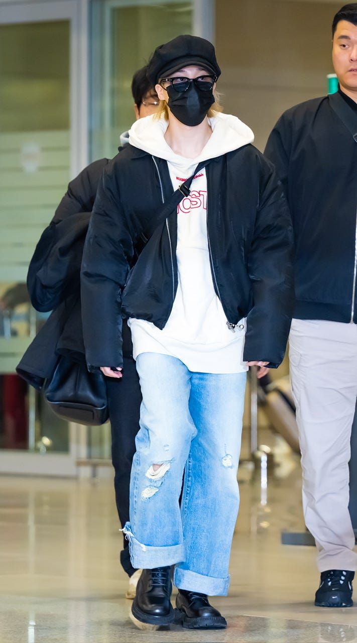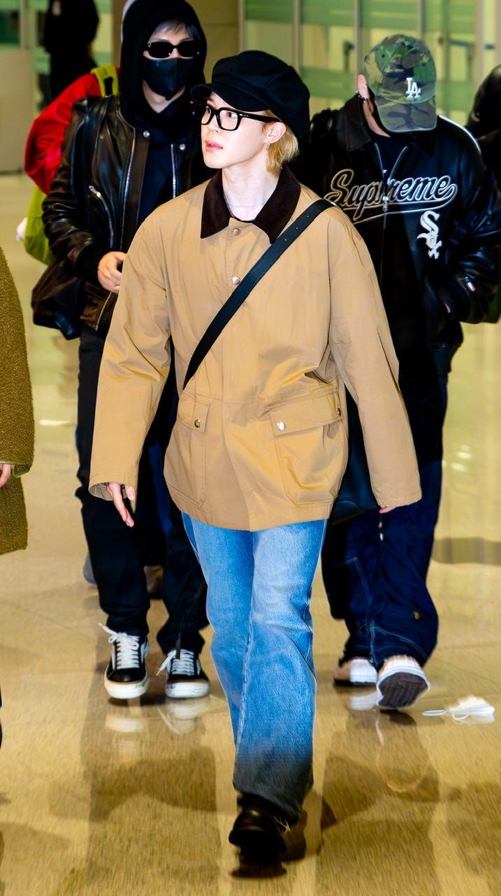 日本に向けて出国するジミンは、上の写真と同じ「R13」のデニムをロールアップせずに着用することで変化をつけて。デニムやブーツ、バッグ、帽子まで同じなのにアウター一つでリラックス感漂うカジュアルムードに雰囲気をガラリとチェンジしたところが秀悦。