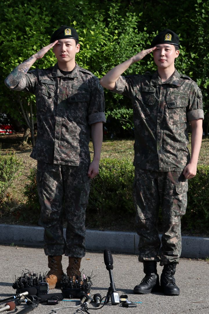 最年長メンバー、ジンの除隊を祝うため、BTSのメンバーたちが久しぶりに一堂に集結。ジョングク(左)とジミン(右)は軍服姿で駆けつけた。