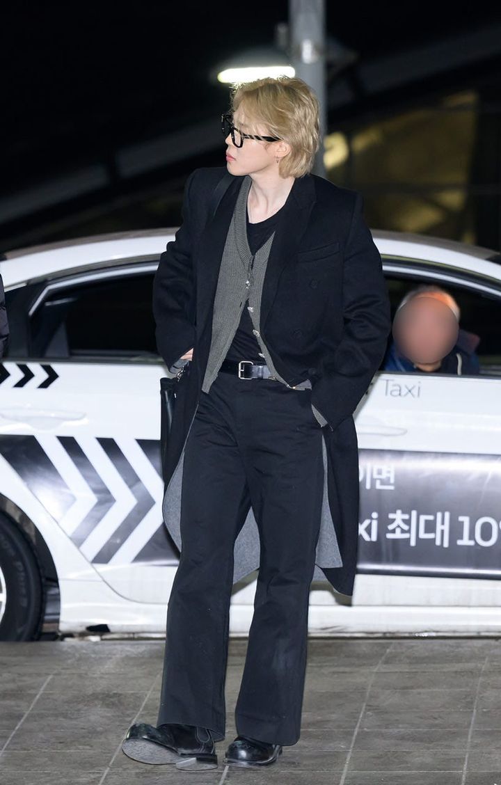 「ディオール」のショーに出席するため、パリへと向かうジミン。シャツの胸元をざっくり開けた姿で、空港中の視線を独り占め! 除隊時よりも引き締まったボディに、ブロンドヘアとメタルフレームのメガネが相まって、スタイリッシュなムードを漂わせて。