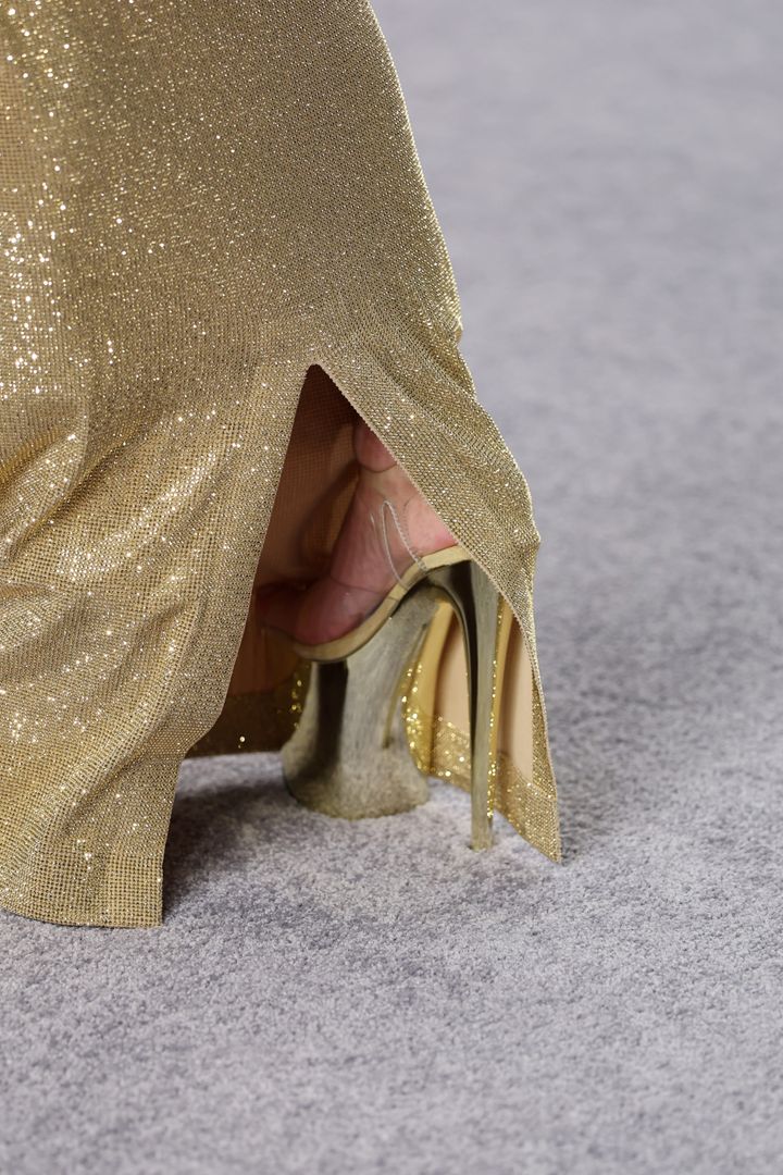 この日のキムは「グッチ」のタイトなドレスという装い。足元はフロントが10センチの厚底でヒールが20センチという、難易度の高い靴だった。準備を終えて、会場に向かってよちよち歩いていたところ、案の定バランスを崩してしまった。