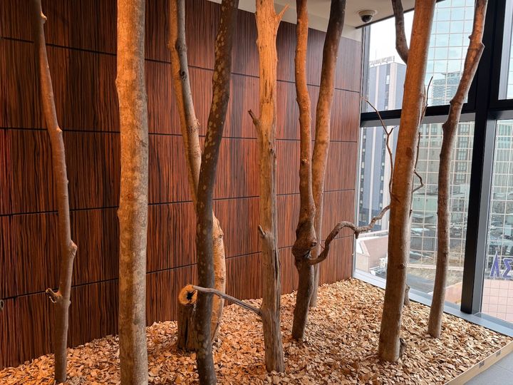 エレベーターホールには、目の前に本物の桑の木やカエデなど6種類の木が大きく天井まで飾られています。木の下にはウッドチップが敷き詰められており、その空間自体に木々の香りがふわりと香り、とても癒される空間になっています。