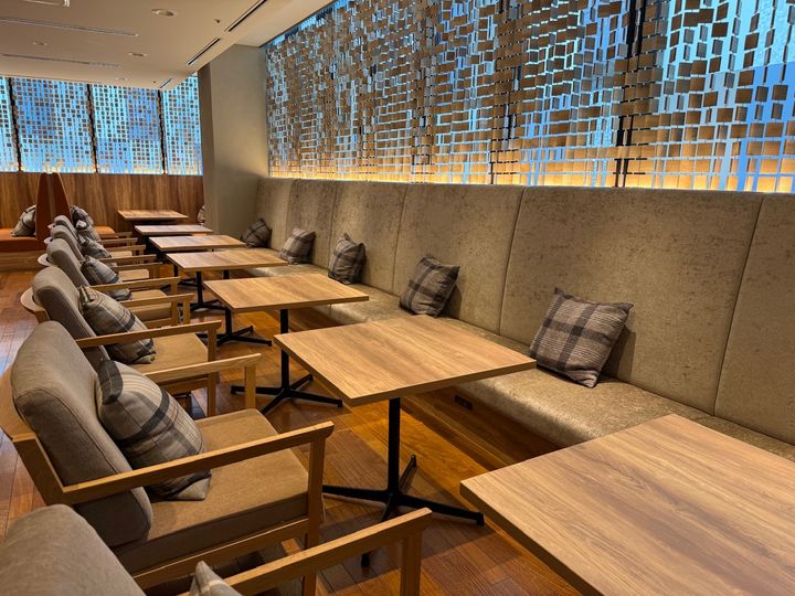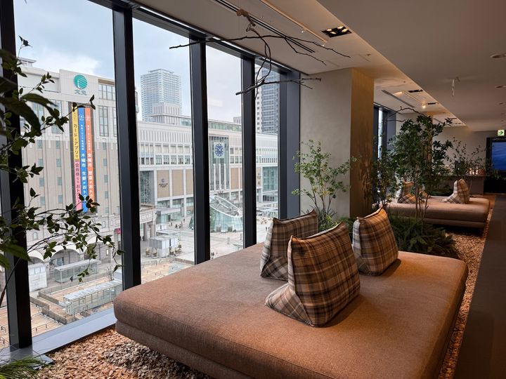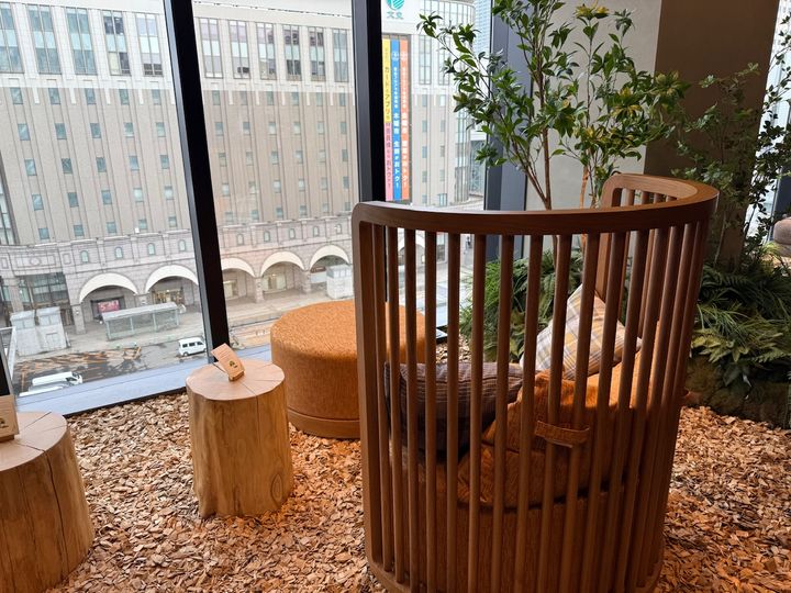 また、エレベーターホールから奥に進むと、大きな窓と広々としていて、木のぬくもりで落ち着く「空っぽゾーン」が広がっています。ウッドチップを敷き詰めた床は柔らかく、高い木の背もたれに囲まれた、一人でゆっくり靴を脱いで過ごせるソファがあるのも印象的でした。街並みを眺めながら、つい腰を下ろしてしまう広いソファも、旅の疲れを癒してくれるスペースになっています。