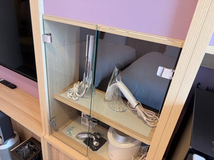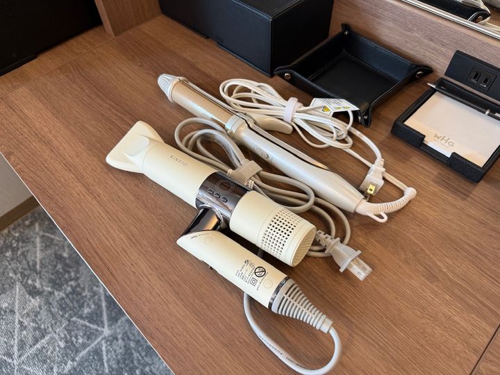 棚には「KINUJO」のドライヤーとヘアアイロンが置かれており、見つけた瞬間、嬉しくなるような女性には特に嬉しい心遣いでした。