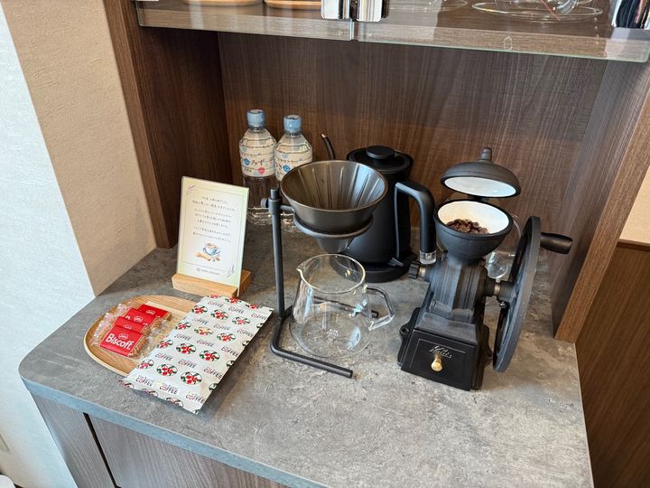 置いてある備品も、一つ一つこだわっているのが印象的でした。レトロなコーヒーミルやドリップセットは、雰囲気があってとても素敵でした。お茶菓子の近くには、心のこもったメッセージが置かれており、気遣いも嬉しいです。