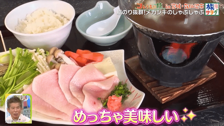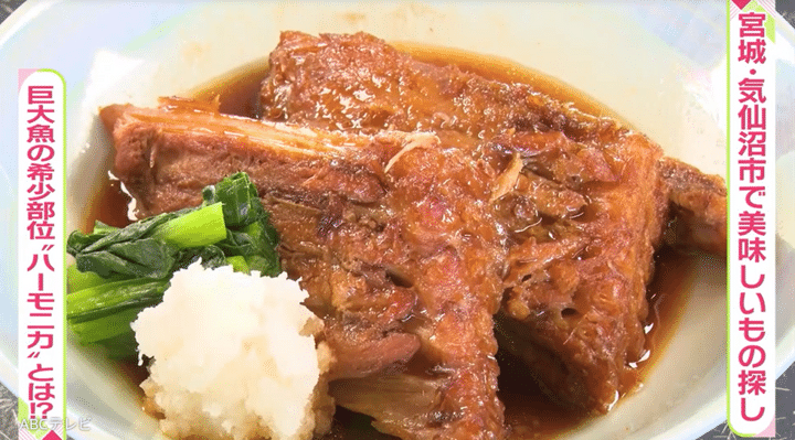 市場関係者いわく今の時期のメカジキは、特に脂乗りが抜群。“メカしゃぶ”ことメカジキのしゃぶしゃぶや、背びれの付け根部分である“ハーモニカ”の煮付けが最高なのだとか。そこで大仁田アナは、海の目の前にあるグルメ&ショッピングスポット・気仙沼お魚いちば内の港町レストラン鮮で、市場関係者おすすめのメガジキグルメ2つを食べてみることに!