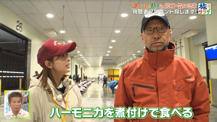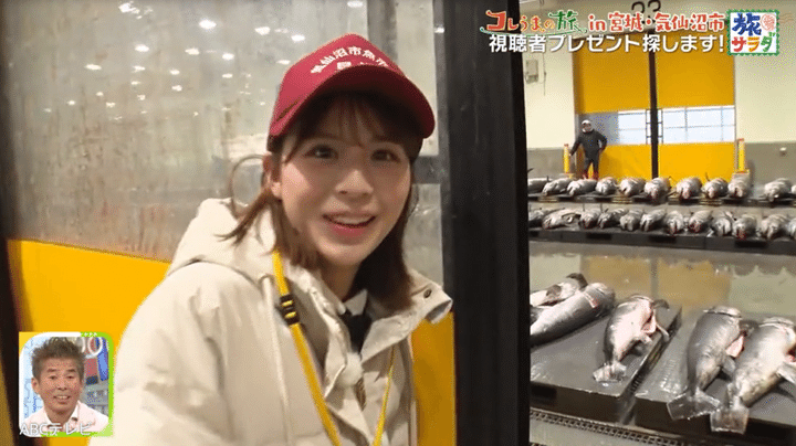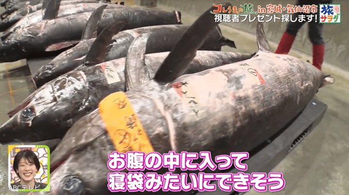 気仙沼市魚市場にやってきた大仁田アナは、ズラリと並ぶメガジキに、「人間より大きい魚がいっぱいいますよ!」「お腹の中に入って寝袋みたいにできそう!」と大興奮! 実は気仙沼市は、メガジキの水揚げ量日本一を誇る。