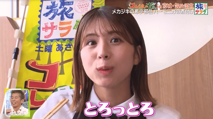 脂が乗ったメカしゃぶを試食した大仁田アナは、「外側フワッフワなんですけど、噛んだ瞬間プリップリで。その後とろみが来ますね!」と感動! 秘伝のタレでじっくり煮込まれたハーモニカの煮付けは、「トロットロ!」「歯がいらない。口に入れた瞬間にほどけていく感じ。うま~!」とのこと。「これはごはんですね」と、大仁田アナはすかさず白米に箸を伸ばし、心底おいしそうに味わった。