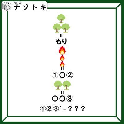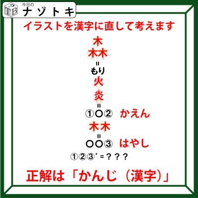 それは漢字です。漢字の「森」とイラストの木の配置が同じですね。つまり、イラストの位置にそれを意味する漢字を配置して言葉をかんg考えます。