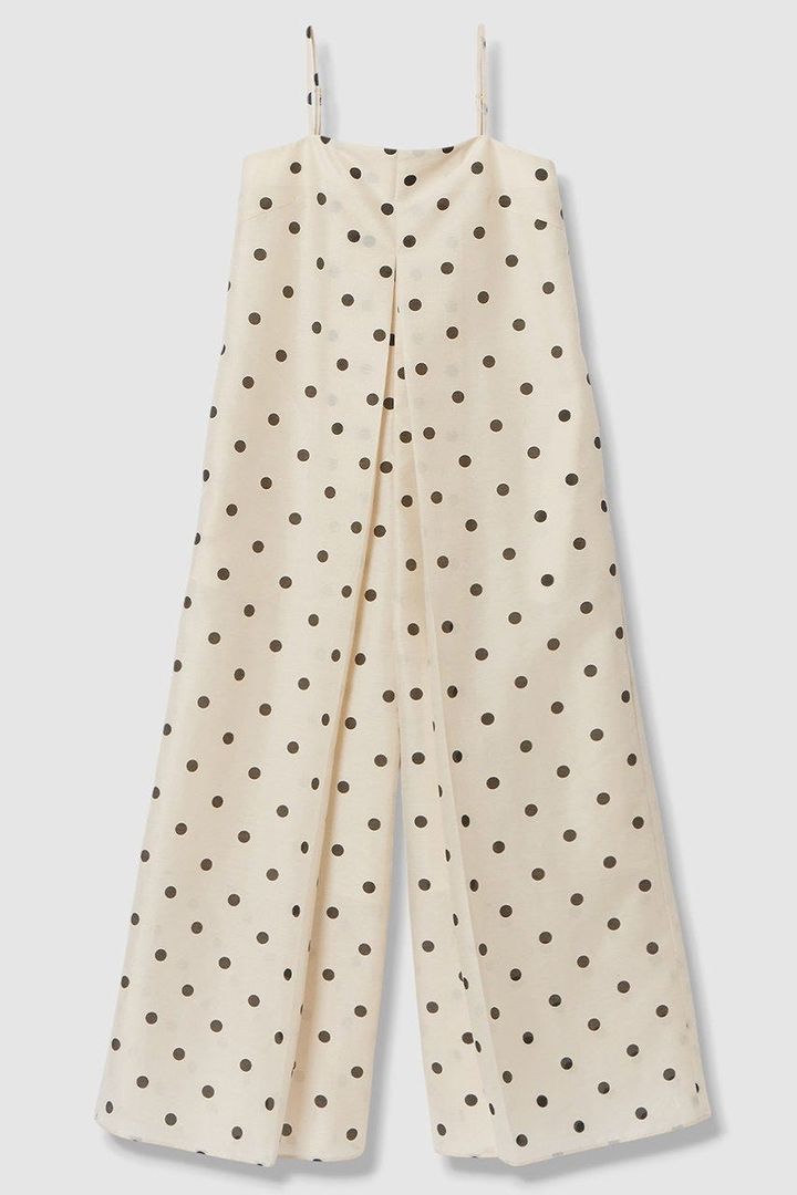 春夏らしい軽やかさのある一着。トレンドのドット柄で旬のムードをまとって。
